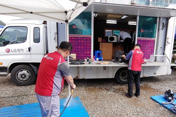 LG전자가 제18호 태풍 ‘미탁’으로 인해 피해가 발생한 지역에서 수해 복구 활동에 나섰다.LG전자는 4일 경북 영덕군과 강원 삼척시에, 5일은 경북 울진군에 임시 서비스지점을 마련했다. 서비스 엔지니어들은 무상으로 침수된 가전을 세척하고 필요에 따라 부품을 교환하는 등 피해지역 주민들이 가전을 사용하는 데 불편을 겪지 않도록 했다.또 강릉과 울진 일부 지역에서는 서비스 엔지니어가 피해 가구를 직접 찾아가 가전제품을 세척했다. LG전자는 효과적인 서비스를 제공하기 위해 서비스 장비를 갖춘 특장차도 운영했다.
