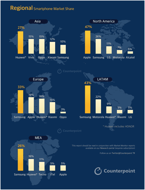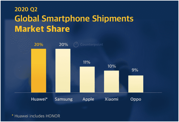2분기 스마트폰 시장에서는 화웨이가 삼성을 제치고 시장 점유율 1위를 달성했다. 화웨이는 글로벌 출하량이 전년 동기 대비 3% 감소했으나, 자국 시장에서 판매량을 11% 늘리며 전체 시장 점유율을 끌어올렸다.