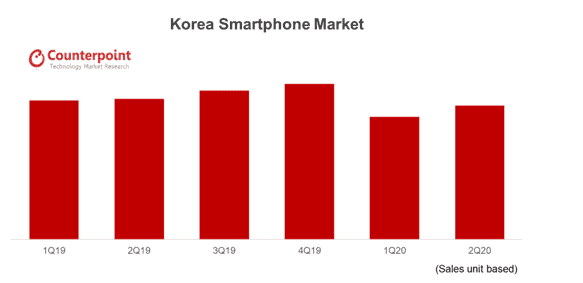 신종 코로나바이러스 감염증(코로나19) 영향으로 타격을 입었던 국내 스마트폰 시장이 지난 2분기에는 회복세를 보였다. 2분기 삼성전자와 애플은 전 분기 대비 점유율이 증가했으며, LG전자는 점유율이 축소됐다.