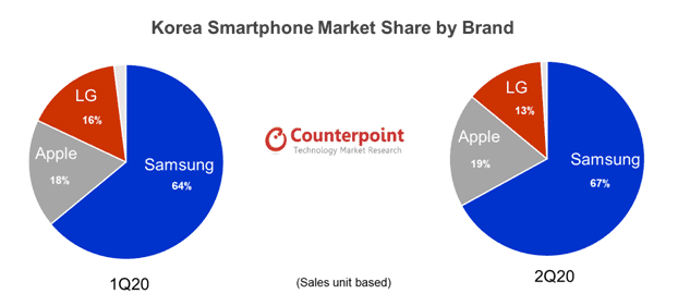 2분기 국내 스마트폰 시장에서 삼성전자와 애플은 시장 점유율을 확대했다. 삼성전자는 갤럭시A시리즈 선전 속에 지난 3월 출시된 갤럭시S20 판매 확대에 힘입어 전분기 대비 3%p 상승한 67% 점유율을 기록했다.