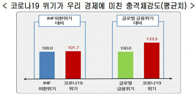 또 코로나19 위기로 인한 경제적 충격체감도에 대해 응답자들은 IMF 외환위기와 비슷한 수준으로, 글로벌 금융위기보다는 30% 가량 더 크게 체감하고 있는 것으로 나타났다. 충격체감도는 IMF 외환위기, 글로벌 금융위기가 우리 경제에 미친 충격을 각각 100이라고 가정하고, 코로나19 위기에 따른 경제 체감 충격을 이와 비교해 평가했다.