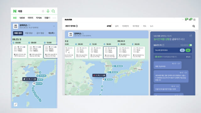 사용자들은 태풍 관련 키워드의 검색 결과를 통해 ▲태풍 경로 ▲태풍의 크기, 강도 ▲태풍에 따른 바람, 강수의 48시간 예보 영상 ▲뉴스, 특보 라이브, 사용자들의 제보 등 다양한 정보를 한 번에 살펴볼 수 있다.