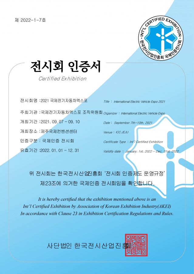 국제전기자동차엑스포(IEVE)는 10일 산업통상자원부 산하 사단법인 한국전시산업진흥회로부터 6년 연속 국제전시인증을 받았다고 밝혔다.