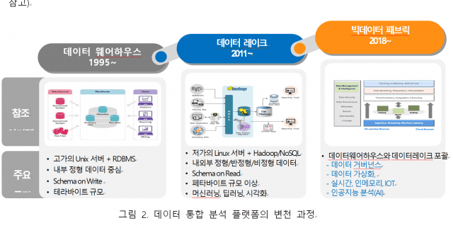 데이터 통합을 전제로한 데이터분석 기술은 1990년대 중반 데이터 웨어하우스를 시작으로 빅데이터 시대가 열리면서 데이터 레이크로 개념이 확대됐고 최근 더 진화한 개념으로 빅데이터 패브릭이 디지털 전환 시대의 모든 디지털 비즈니스를 운용할 수 있는 빅데이터 플랫폼으로 주목 받고 있다. (그림2. 참고)