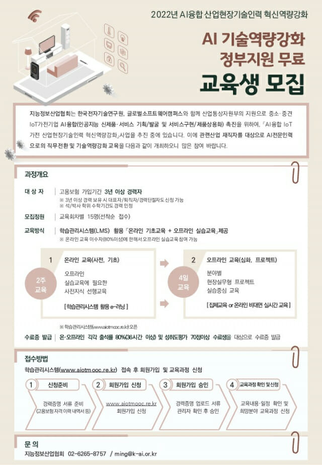 이번 교육은 산업통상자원부의 ‘AI융합 IoT가전 산업현장기술인력 혁신역량강화’ 사업 일환으로 지능정보산업협회가 한국전자기술연구원, 글로벌소프트웨어캠퍼스와 공동 으로 운영한다. 기업과 제조업에 종사하는 인력을 대상으로 AI 융합 교육을 시행, 산업을 선도할 핵심인력을 양성하기 위한 사업으로 2021년부터 매년 개최하고 있다.