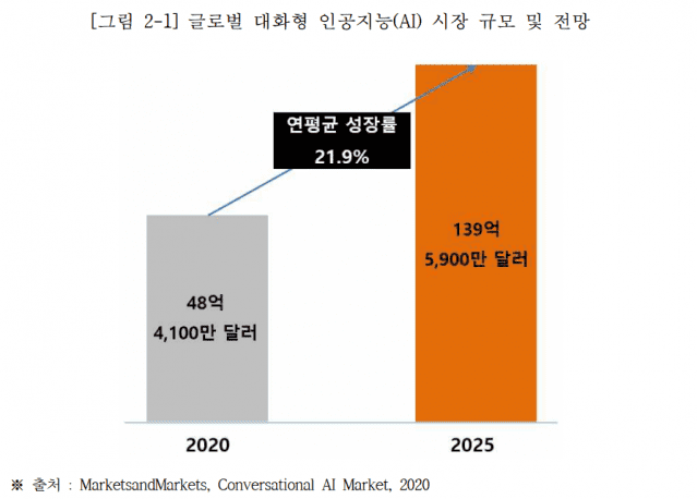 시장조사기관 마켓앤마켓에 따르면, 전 세계 대화형AI 시장은 2020년 48억4천100만 달러(약 6조3천억원)에서 연평균 21.9% 성장해 2025년에는 139억5천900만 달러(약 18조1천억원)에 이를 것으로 전망된다.