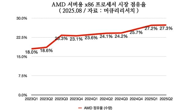 AMD는 시장조사업체 머큐리리서치가 최근 공개한 x86 프로세서 출하량 보고서를 인용해 "올 2분기 서버용 x86 프로세서 시장에서 역대 최고 수준인 27.3% 점유율을 기록했다"고 밝혔다.