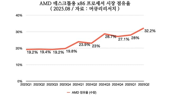 AMD는 올 2분기 데스크톱 PC용 프로세서 시장에서도 최근 5년간 최대 수치인 32.2% 점유율을 확보했다. 지난 해 3분기 라이젠 9000 시리즈 프로세서 출시를 기점으로 28.7%를 기록 후 1년만이다.