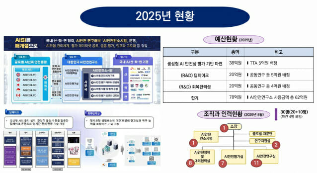 AISI는 표준화 등 법적으로 해야 할 미션이 있다. 하지만 현재 조직과 인력으로는 역부족인 상황이다. AISI 출범시 당국은 정규 연구인력을 30명 플러스 알파(+α)로 주기로 했다. 이 약속은 지켜지지 않았다. 현재 AISI 정규 연구원은 20명이다. 예산은 올해 76억인데 내년에 비R&D 부문 예산이 늘었다.