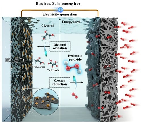 양극에서 글리세롤이 산화돼 글리세르산으로 바뀌면서 전자를 내놓고, 이 전자가 음극으로 이동해 산소를 환원시켜 과산화수소(H₂O₂)를 만든다.