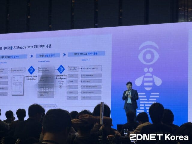 이후 한국IBM 이호승 데이터 플랫폼 테크 세일즈 총괄 전무는 AI 레디 데이터 환경 구축을 위한 전략으로 '왓슨x' 플랫폼 기반 '데이터 통합'과 '데이터 인텔리전스'를 제시했다. 기업 내 흩어진 데이터를 한곳으로 통합하고 품질을 높여야 AI 비즈니스 효과를 극대화할 수 있다는 이유에서다.