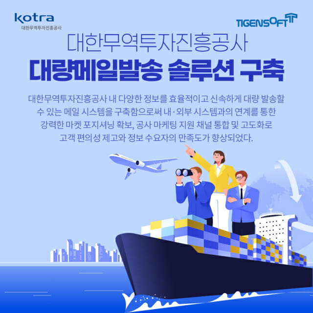 티젠소프트가 대한무역투자진흥공사에 대량메일 발송 솔루션을 구축했다. 대한무역투자진흥공사는 이번 시스템을 구축함으로써 내·외부 시스템과의 연계를 통한 강력한 마켓 포지셔닝 확보와 공사 마케팅 지원 채널의 통합·고도화를 이뤄냈다.