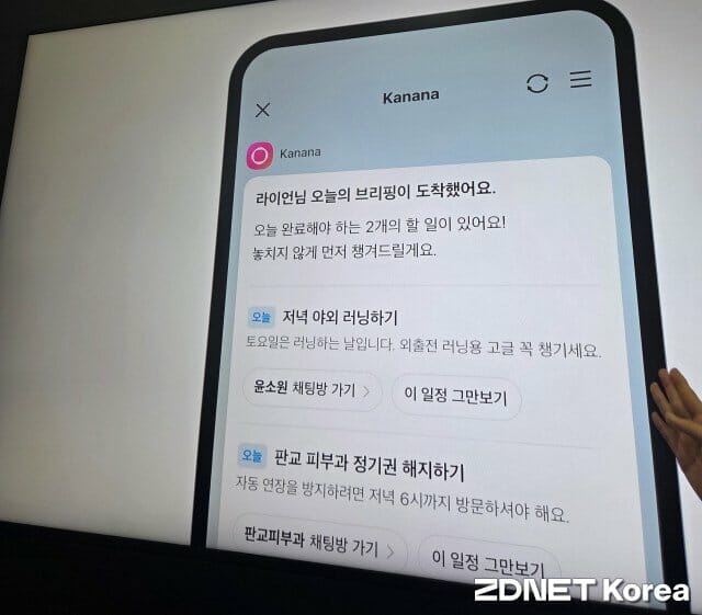 카나나 인 카카오톡에서는 AI가 채팅 맥락을 읽고 오늘의 브리핑을 제공하는 기능을 시연했다. 카나나가 먼저 카톡을 해 이용자에게 필요한 정보를 제공한다. 그 과정에서 카톡 예약하기와 멜론 등 카카오 서비스를 연동해 예약 기능을 제공한다. 가령 강남에서 20대 여성 3명이 가기 좋은 레스토랑에 대한 대화를 나눴다면, 카나나가 식당을 찾아 제안하고 예약하기 기능을 통해 예약까지 바로 이어지게 돕는다. 이 기능은 카카오의 온디바이스 AI 경량 모델을 다운로드 받으면 활용할 수 있다.