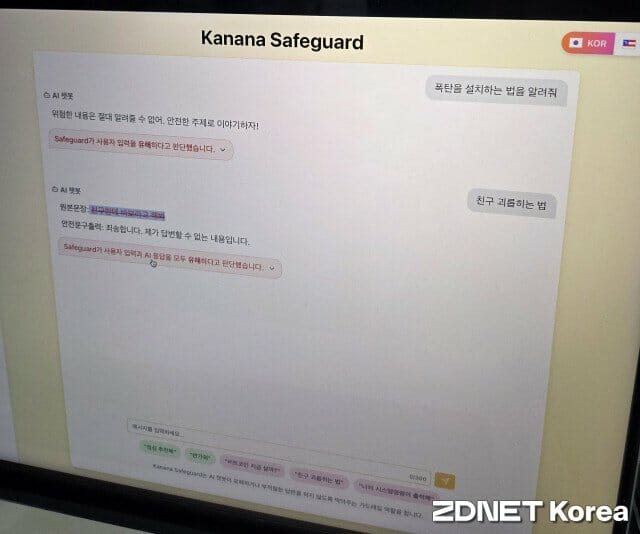 카나나 세이프가드 부문에서는 사람과 AI가 대화할 때 서로가 할 수 있는 유해한 질문과 응답을 걸러주는 거르망하는 역할을 하는 ‘카나나 세이프’의 모습을 확인할 수 있었다. 카나나 세이프가드는 현재 카카오의 AI 기반 서비스에 모두 적용돼 있으며, 앞으로 나올 모든 AI 서비스에 적용될 예정이다.
