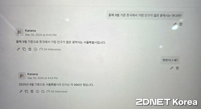멀티턴도 가능했다. 한국에서 가장 인구가 많은 광역시에 대해 질문했을 때 “서울특별시”라고 즉답했고, 바로 인구가 얼마냐고 묻자 “올해 9월 기준으로 서울특별시의 인구는 990만명”이라고 답변했다.