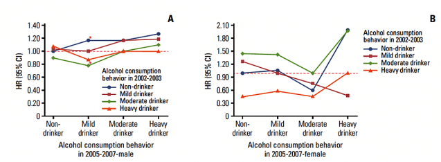 비음주자가 새롭게 음주를 시작할 시 가벼운 수준으로 즐기더라도 위암 위험이 약 14% 증가(상대위험도 1.14)했으며, 반대로 중등도의 음주자는 경도 수준으로 줄일 경우 발병 위험이 약 20% 감소(상대위험도 0.80)했다.