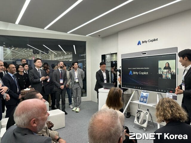 마지막으로 류 차관과 대사단은 삼성SDS 부스에 설치된 브리티 코파일럿 체험존을 방문했다. 실시간으로 이뤄지는 브리티 코파일럿의 회의 기능 시연을 관람했다.