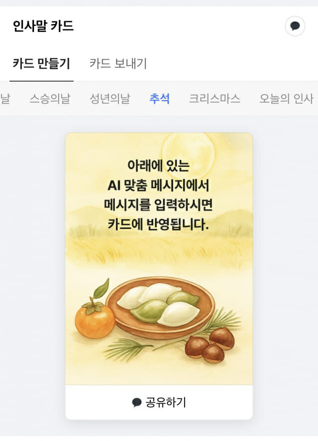 카카오 관계자는 "이번 추석에는 AI가 만들어 주는 인사말 카드로 따뜻한 마음을 전하길 바란다"며 "앞으로도 누구나 쉽고 편리하게 활용할 수 있는 AI 기능을 제공하기 위해 노력하겠다"고 말했다.