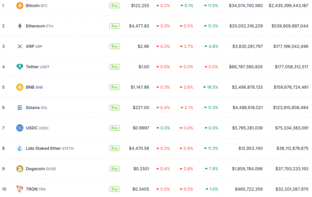 비트코인은 11.5% 상승해 12만2천255달러를 기록하며 12만 달러대를 안정적으로 회복했다. 이더리움도 11.3% 오르며 4천477달러를 나타냈다.