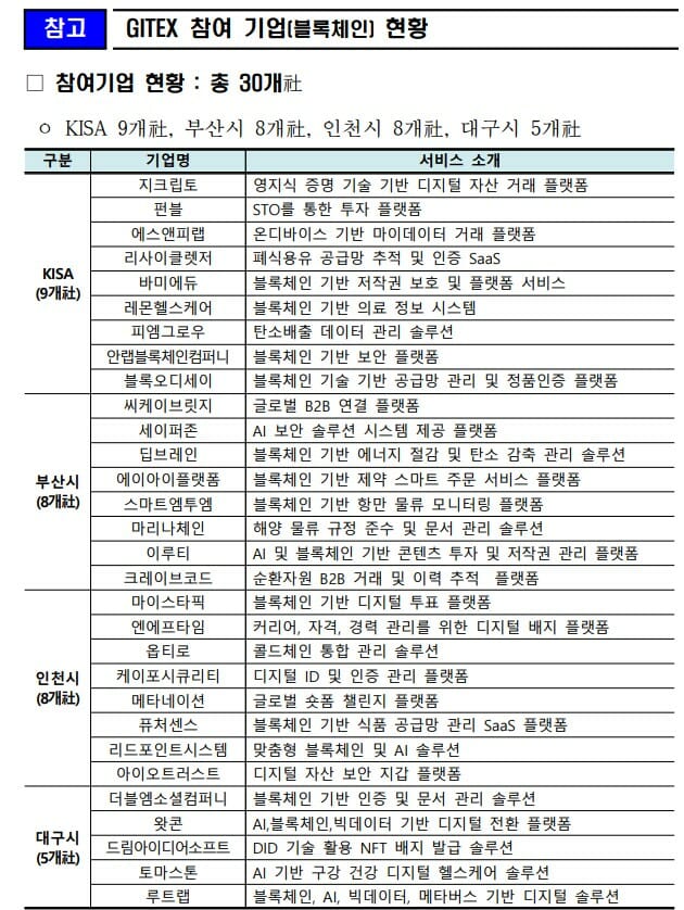 과기정통부는 KISA, 부산광역시, 대구광역시, 인천광역시 등과 함께 디지털 수출개척단 활동의 일환으로 오는 13일 개막하는 중동 최대 정보통신 박람회인 ‘GITEX’에 국내 블록체인 기업 30개사의 참가를 지원한다. 역대 최대 규모 참가다. 이 행사는 17일까지 이어진다.