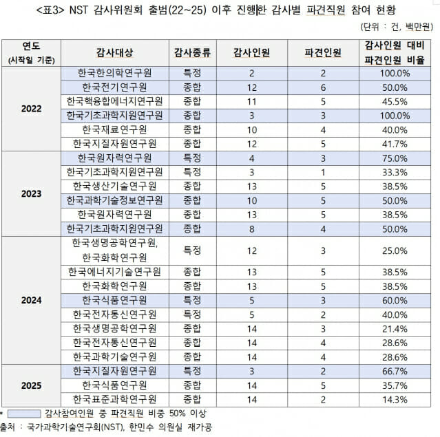 국회 과학기술정보방송통신위원회 소속 한민수 의원(더불어민주당, 서울 강북구을)이 국가과학기술연구회(NST)로부터 제출받은 자료를 분석한 결과, 전체 출연연 23곳 중 최근 4년간 단 한 차례도 감사를 받지 않은 기관은 총 7개(30.4%), 특정감사와 종합감사를 한 해 안에 중복해 진행한 기관도 5개(21.7%)로 나타났다.