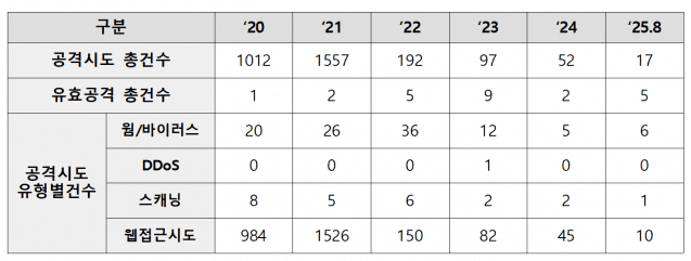 연도별로 살펴보면 ▲2020년 1천12건 ▲2021년 1천557건 ▲2022년 192건 ▲2023년 97건 ▲2024년 52건 ▲2025년 8월 말까지는 17건이다. 유효 공격 수는 ▲2020년 1건 ▲2021년 2건 ▲2022년 5건 ▲2023년 9건 ▲2024년 2건으로 조사됐다.