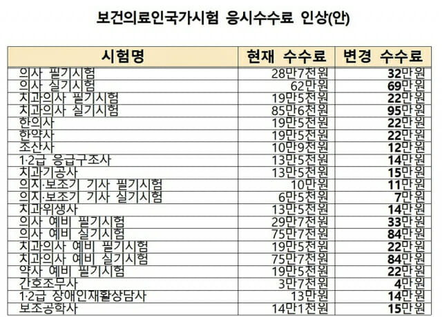 약사, 간호사, 영양사, 위생사, 임상병리사, 작업치료사, 보건의료정보관리사, 안경사, 물리치료사, 방사선사, 1·2급 언어재활사 등의 응시수수료는 동결됐다.