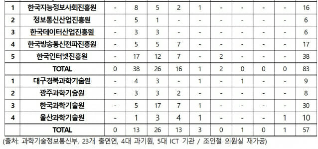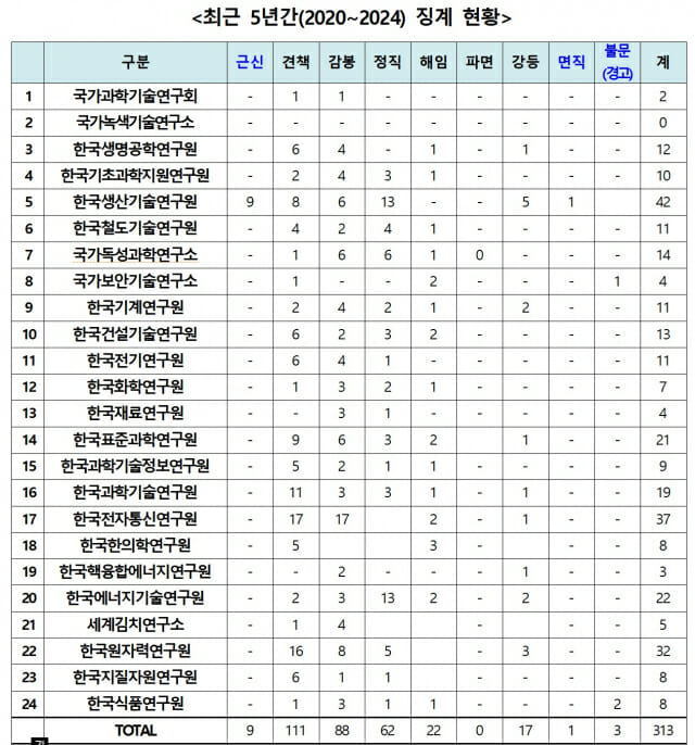 출연연 가운데서는 한국생산기술연구원(KITECH·42건), 4대 과학기술원 중에서는 한국과학기술원(KAIST·30건), ICT 기관 중에서는 한국방송통신전파진흥원(17건)이 징계 건수가 가장 많았다.