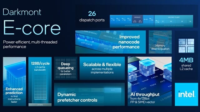 E코어 '다크몬트'는 전 세대인 스카이몬트 아키텍처를 개선했다. 콘텐츠 제작과 AI 추론에 쓰이는 벡터 명렁어 처리 성능으르 개선하고 실행중인 명령어 패턴을 학습해 동적으로 데이터를 미리 가져오는 AI 기반 프리페처(Prefetcher)를 내장했다.