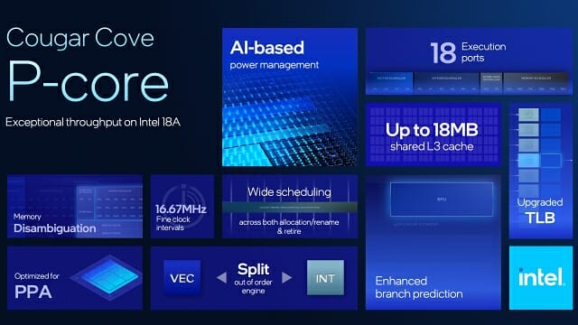 팬서레이크의 CPU는 고성능으로 빠른 응답성을 확보한 P코어 '쿠거 코브', 일상적인 작업을 저전력·고효율로 처리하는 E코어 '다크몬트'로 구성됐다. 여기에 2023년 코어 울트라 시리즈1(메테오레이크)에 처음 도입된 저전력 스카이몬트 코어가 추가됐다.