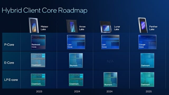 코어 울트라 200H(2024, 애로우레이크)는 라이언 코브, 스카이몬트, 크레스트몬트 등 3가지 아키텍처를 모두 적용했다. 코어 울트라 200V(2024, 루나레이크)는 프로세서 코어를 P코어와 LP-E코어로 이원화했고 E코어는 빠졌다.