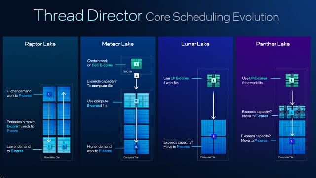 라즈쉬리 차북스와 인텔 클라이언트 컴퓨팅 그룹 전력 및 성능 최적화 부문 펠로우는 "팬서레이크에 내장된 스레드 디렉터는 명령어 분류 모델을 최적화했다. LP E코어에서 먼저 작업을 실행한 다음 E코어, P코어 순으로 실행하는 작업을 옮긴다"고 설명했다.