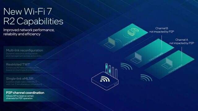 와이파이7 R2는 다중 연결 환경에서 주파수 상태에 따라 자동으로 연결 상태를 제어하는 멀티링크 재설정, 저지연 연결이 필요한 기기에 채널을 우선 배분하는 제한적 TWT, 기기끼리 와이파이로 직접 통신할 때 간섭을 줄이는 P2P 채널 조정 기능 등을 포함한다.