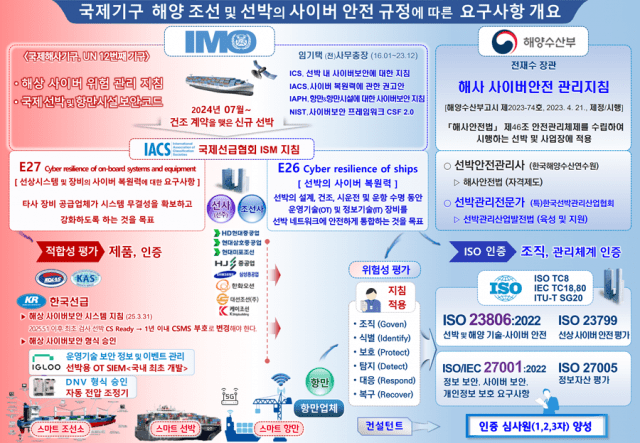 국제선급협회(IACS)는 해상 사이버 위험관리 지침(Guidelines on Maritime Cyber Risk Management)에 근거해 작년 7월부터 건조 계약을 체결한 신조선에 대해 사이버 복원력 공통규칙을 적용하고 있다.