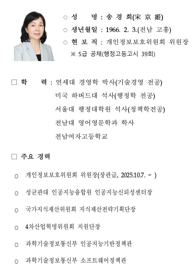 10일 송경희 개인정보위원회 위원장은 정부서울청사 별관 2층 대강당에서 3대 위원장(장관급) 취임식을 갖고 이 같은 정책 방향을 밝혔다. 1966생인 송 위원장은 전남 고흥출신으로 행정고등고시 39회로 공직에 입문했다. 연세대 경영학 박사(기술경영 전공)와 미국 하버드대 석사(행정학 전공), 서울대 행정대학원 석사(정책학전공), 전남대 영어영문학과 학사, 전남여자고등학교를 졸업했다.