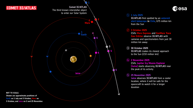 앞으로 몇 달 안에 다른 우주선들도 이 얼음 천체에 주목할 예정이다. 그 중에는 목성을 향해 가고 있는 ESA의 주스(JUICE) 탐사선도 포함된다. 주스는 혜성이 태양에 가장 가까이 접근한 지 불과 3일 후인 11월 2일에 3I/ATLAS를 관측하기 시작할 예정이다. 이때 혜성과의 거리는 2억 1천만㎞에 달할 것으로 예상된다.