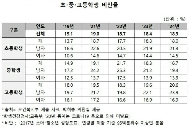 국회 보건복지위원회 소속 박희승 국회의원(남원장수임실순창, 더불어민주당)이 보건복지부로부터 제출받은 자료를 분석한 결과, 2019년 대비 지난해 초·중·고등학생의 비만율은 15.1%에서 18.3%로 높아졌다.