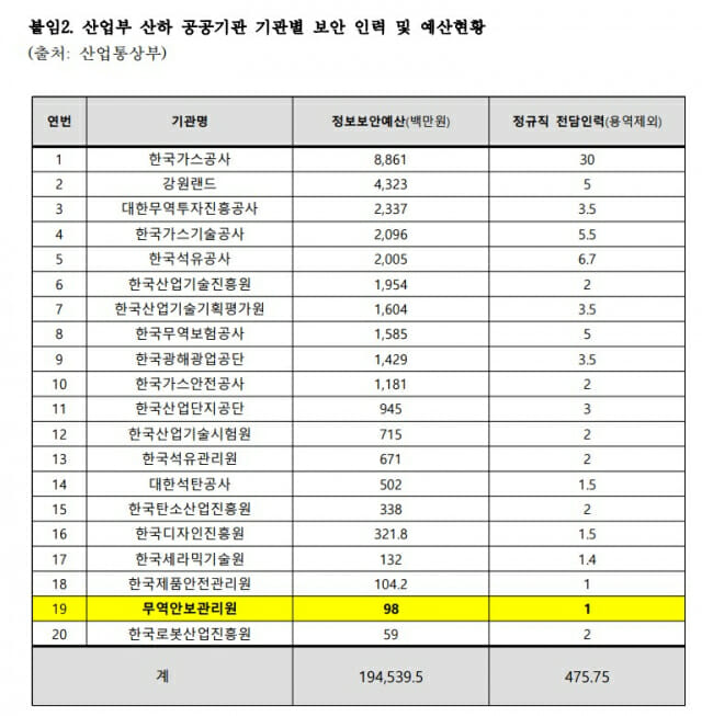 자료에 따르면, 특히 전략물자 통제와 대외거래 감시를 담당하는 ‘무역안보관리원’의 보안 실태는 심각한 수준으로, 최근 5년간 224건의 해킹 시도 탐지가 발견됐지만, 정보보안 예산은 연 9800만 원에 불과하고, 정보보안을 전담하는 정규직 인력도 1명에 그쳤다. 해킹 시도 탐지 건수가 유사한 한국가스공사(211건)의 경우 정보보안 전담 인력만 30명, 예산은 연 88억원 이상이다.