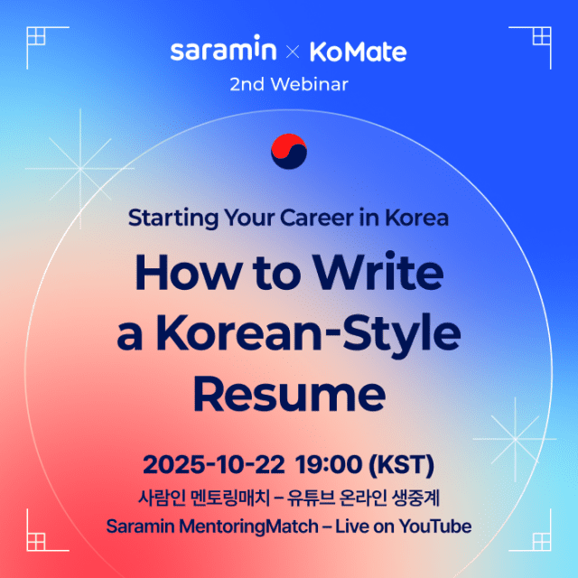 유튜브를 통해 생중계되는 이번 웨비나는 '한국식 이력서 및 자기소개서 작성'을 주제로 열린다. 코메이트는 우리나라 채용 문화에 익숙하지 않은 외국인 구직자들이 단기간에 국내 기업 인사담당자들의 눈을 사로잡는 이력서를 쓰고, 한국에서 성공적으로 커리어를 시작할 수 있도록 돕기 위해 웨비나를 마련했다.