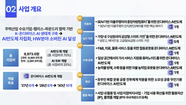 정부는 이번 K-온디바이스 AI 반도체 개발에 총 9천973억원의 사업비를 조성했다. 국비 6천891억5천만원, 시스템 수요 기업들의 3천81억5천만으로 구성됐다.
