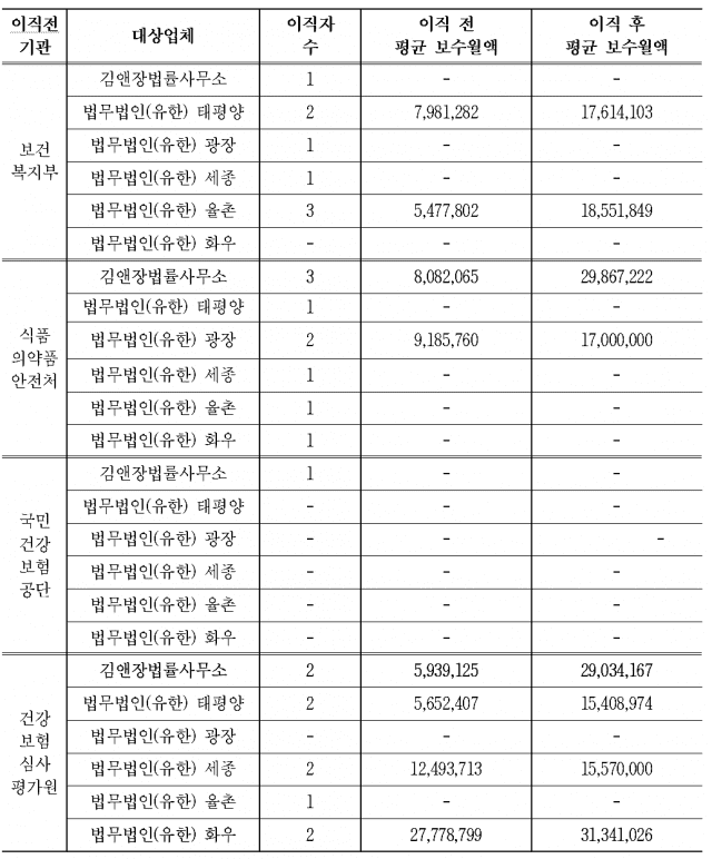 이어 식약처에서 김앤장으로 이직한 사람들은 약 2천986만 원이었다. 심사평가원에서 김앤장으로 이직한 사람들의 평균 보수월액은 593만 원에서 2천903만 원으로 약 5배 인상됐다.