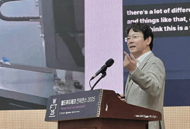 박종훈 뉴로메카 대표가 13일 서울 한국과학기술회관에서 열린 '월드푸드테크 2025 컨퍼런스'에서 푸드테크 자동화의 현실과 과제를 짚고, 피지컬 AI와 휴머노이드를 결합한 조리 자동화 구상을 공개했다.