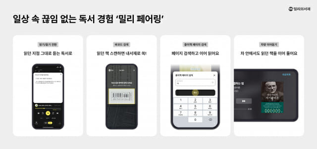 밀리 페어링은 끊임없는 독서를 핵심 가치로, 기기나 상황·공간 변화의 제약 없이 읽던 책을 이어 볼 수 있도록 설계된 독서 지원 기능이다. 구독자는 이를 통해 출퇴근길 운전 중에는 오디오북으로, 집에서는 전자책으로, 휴식 시간에는 종이책으로 자연스럽게 전환하며 환경이나 디바이스가 바뀌어도 자유롭게 독서를 이어갈 수 있다.