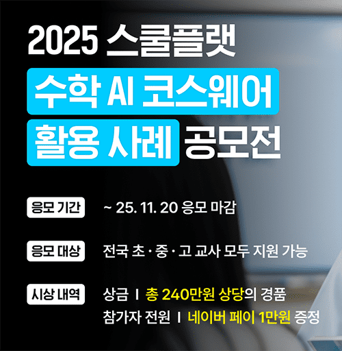 에듀테크 스타트업 프리윌린(대표 권기성)은 이달 21일부터 다음달 20일까지 ‘2025 스쿨플랫 수학 AI 코스웨어 활용 사례 공모전’을 개최한다. 이번 공모전은 교사들이 실제 수업 현장에서 AI 수학 코스웨어 ’스쿨플랫’을 어떻게 활용했는지를 발굴하고 공유해, 공교육의 교수·학습 혁신을 전국 단위로 확산시키는 데 목적이 있다. 전국 초·중·고등학교 교사라면 누구나 응모할 수 있다.