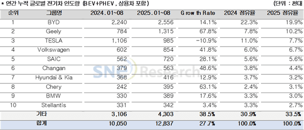 현대차그룹은 12.9% 증가한 약 41만6천대의 전기차를 판매해 7위를 기록했다. 시장점유율은 0.5%p 낮아졌다. 순수전기차에서는 아이오닉5와 EV3가 주력으로 실적을 이끌었고, 캐스퍼(인스터) EV, EV, 크레타 일렉트릭 등 소형, 전략형 신차도 긍정적 반응을 얻었다. 반면 EV6, EV9, 코나 일렉트릭 등 일부 기존 모델은 둔화가 이어지며 성장이 제한됐다. 북미에서는 11만8천대를 인도해 테슬라와 GM에 이어 3위를 기록했다. 전년 대비 14.8% 감소했음에도 포드, 스텔란티스, 도요타, 폭스바겐을 앞섰다.