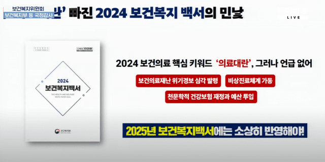 지난해 보건복지부가 발간한 ‘2024 보건복지백서’에 의대 정원 증원에 따른 전공의 및 의대생 집단 이탈 등 의료대란이 삭제된 것에 대해 정 장관이 개선하겠다고 밝혔다.