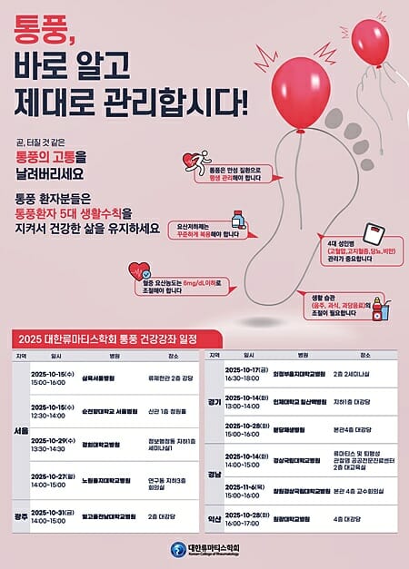 차훈석(성균관의대) 대한류마티스학회 이사장은 “통풍은 단순히 관절 통증에 그치지 않고 심혈관질환, 신장질환 등 다양한 합병증으로 이어질 수 있는 질환인 만큼 평생 관리가 필수적”이라며 “이번 건강강좌를 통해 통풍은 조기 관리와 생활습관 개선으로 충분히 조절 가능한 질환임을 널리 알리고, 국민들이 실천 가능한 생활 수칙을 통해 통풍으로 인한 고통을 줄이고 삶의 질을 높일 수 있도록 적극적으로 노력하겠다”고 밝혔다.