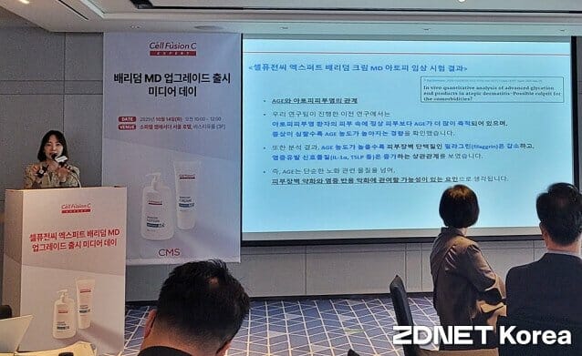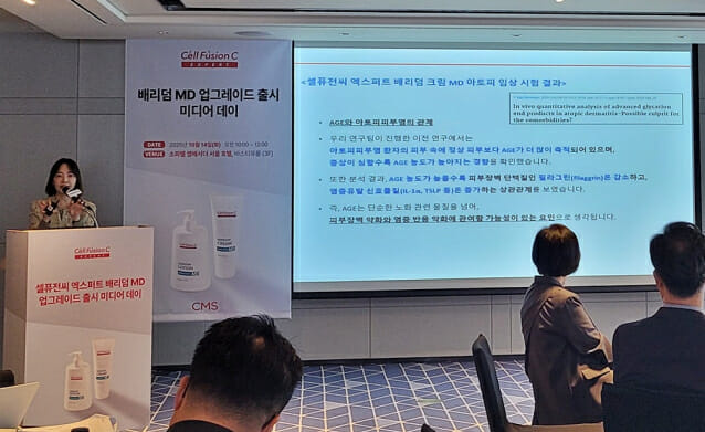 이 자리에서 씨엠에스랩(CMS LAB) 셀퓨전씨 엑스퍼트 사업부는 ‘아토피피부염 환자의 아주 보통의 하루를 지키는 여정: 약산성 피부와 배리덤 MD의 만남’을 주제로 배리덤 MD 업그레이드 제품의 개발 배경과 차별화된 효능 및 안전성에 대해 발표했다.
