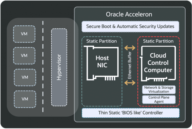 오라클 액셀러론은 전용 네트워크 패브릭, 직접적인 데이터 경로, 통합 NIC(네트워크 인터페이스 카드)를 결합해 성능과 효율을 극대화한다. 또한 호스트 수준의 제로 트러스트 라우팅과 다중 평면 설계를 적용해 보안성과 복원력을 강화했다.
