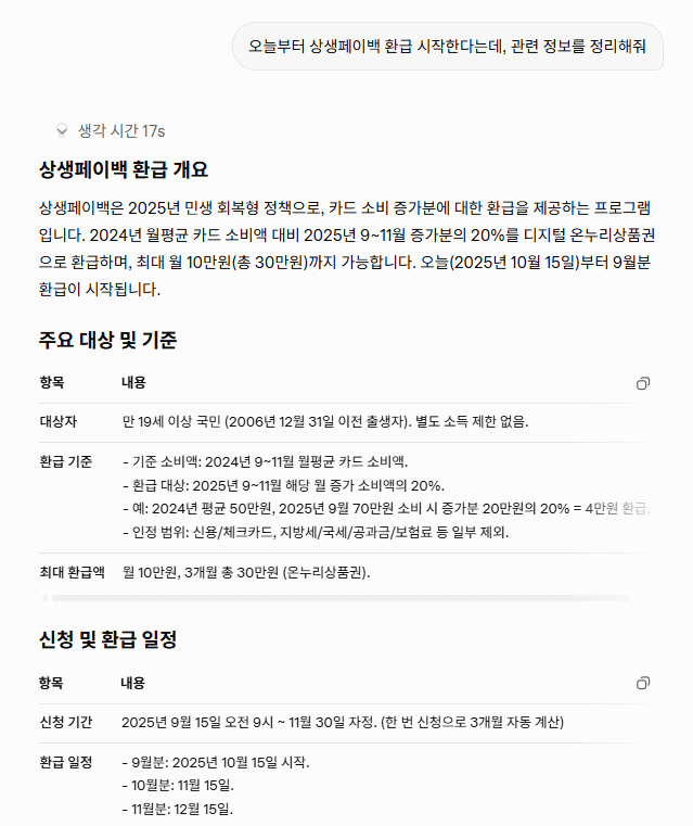 질문: 오늘부터 상생페이백 환급 시작한다는데, 관련 정보를 정리해줘